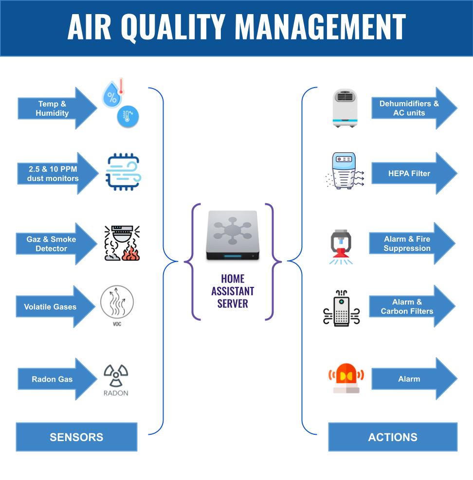 Unlike temperature which can easily be measured and adjusted with a thermostat, monitoring and managing for all the possible elements which can affect air quality is no easy task, even for an advanced automation system, which explains why there is no commercially available solution for homes.